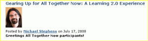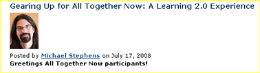 So that’s what we are going to do. But Iwe’re not going it alone; we’ve asked 2.0 guru, Dominican faculty member, and season trainer Michael Stephens to join us for the ride. Beginning Monday, July 21, Michael will author a blog here on SLJ.com that will lead us through the different exercises, offer guidance, answer questions, and even provide a little hand-holding. We’re calling it “All Together Now: A 2.0 Learning Experience.”